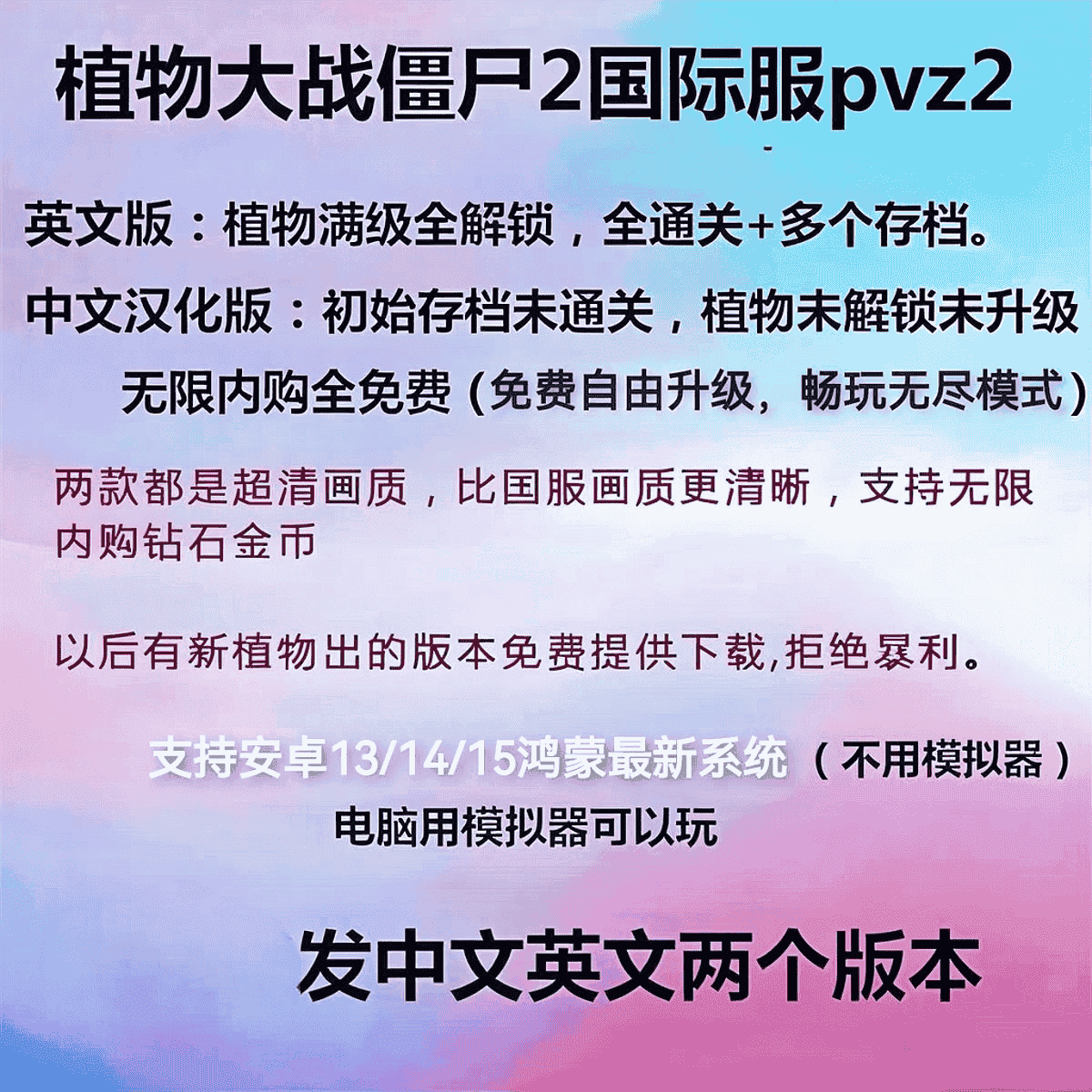 【手机端+PC模拟器】植物大战僵尸2国际服内购版|12.1.1版本|中文版+英文版 双版本|无限内购 金币钻石|单机版【0.9G】