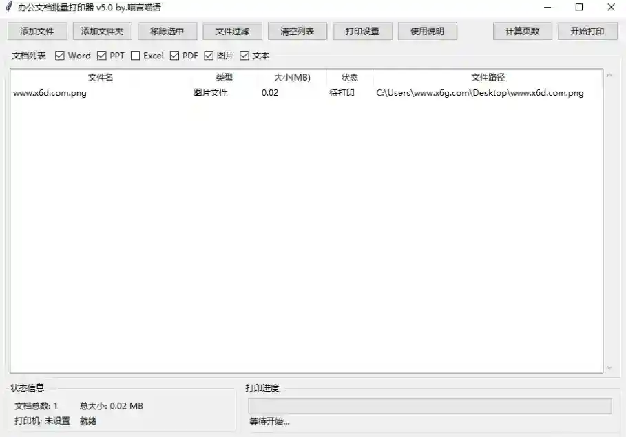 该软件支持Word、PowerPoint、Excel(v2.0)、PDF四种主流文档格式的批量打印,通过直观的图形界面让用户轻松管理大量文档的打印任务。