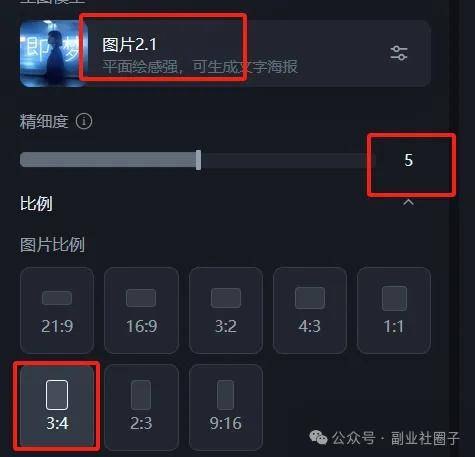 在下方的参数中调整,我使用的是2.1版本,精细度默认为5,比例选择为3:4(适合某红薯,某音推荐9:16)