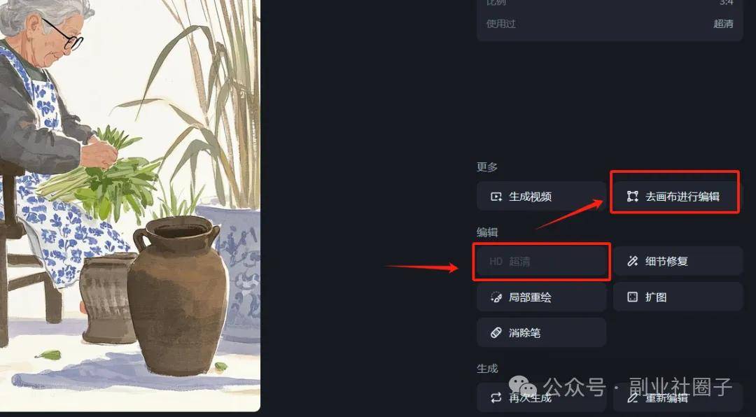 这里我选择空白位置不错的图片,因为后面需要添加文案,点开后,选择HD超清,生成后再次点进去,选择去画布中编辑