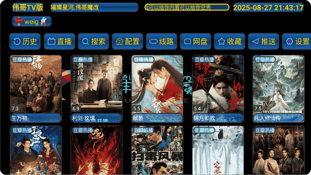 伟哥TV版是一款基于影视仓魔改的影视TV,风格特别,内置了源,需要手动配置即可,内置的是饭太硬的稳定线路,所以安装即用,喜欢这款魔改TV影视仓的可以下载使用,无自己配源,就可以轻松搞定~