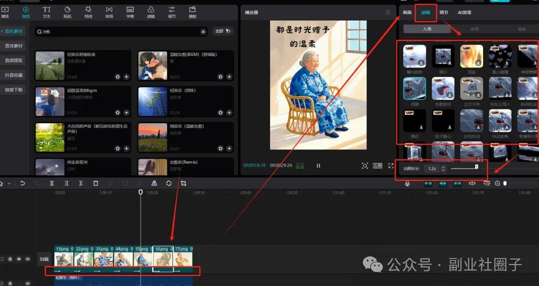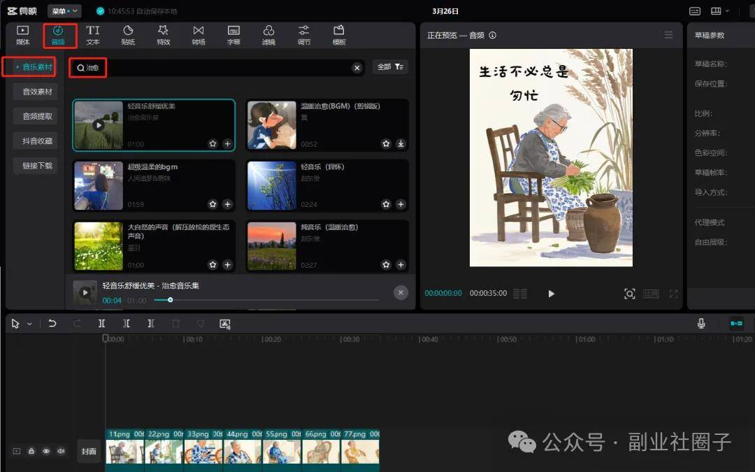 点击左上角添加背景音乐,在搜索框中搜索治愈,挑选一个应景的音乐,然后点击+号
