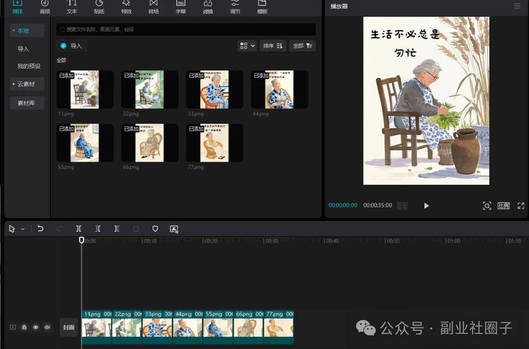 然后,将生成的图片导入进剪映,按照顺序排好